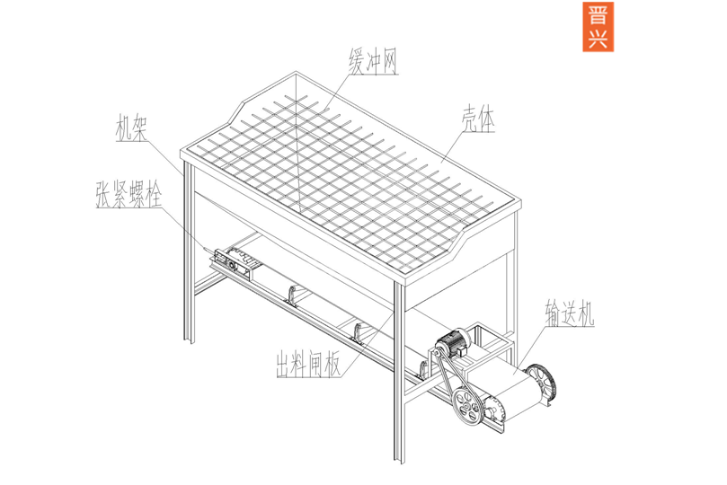 本產(chǎn)品作為物料加工過(guò)程中的原料倉(cāng)使用,適用于鏟車(chē)裝填物料,出料時(shí)可實(shí)現(xiàn)勻速不間斷輸出,從而節(jié)省人工,提高工作效率。2.結(jié)構(gòu):該機(jī)由機(jī)架、殼體、緩沖網(wǎng)、輸送機(jī)組合而成。